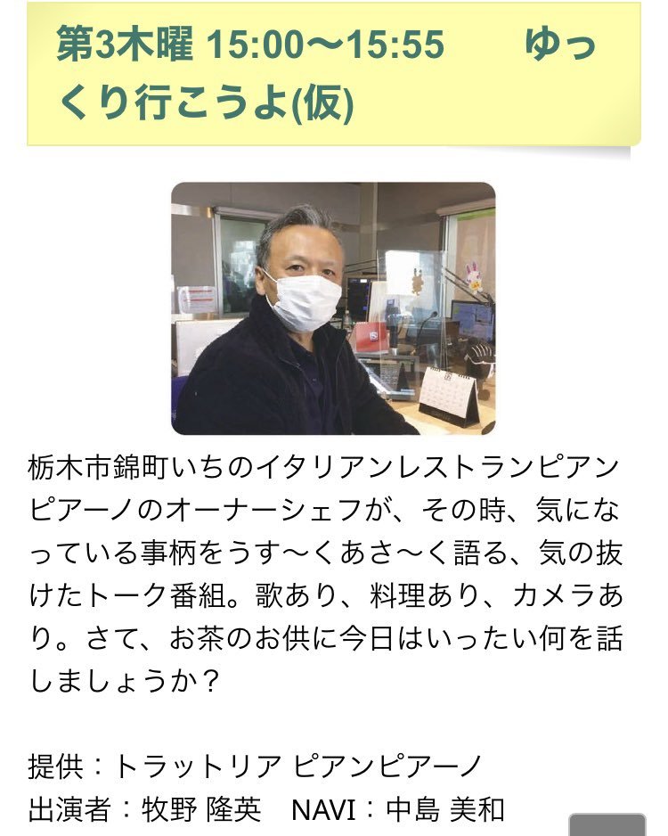 このあと15時からは「#ゆっくり行こうよ(仮)」#トラットリアピアンピアーノ の提供で、オーナーの牧野さんとお送りしていきます🍝...