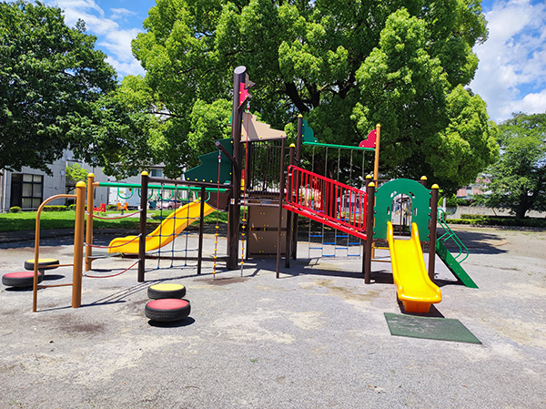 噴水のある日本庭園と子どもたちも笑顔になる楽しい遊具のある公園