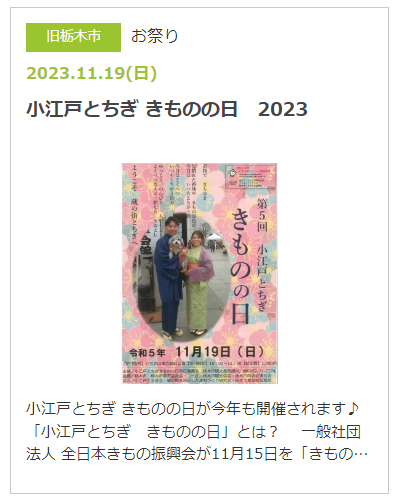 一般社団法人全日本きもの振興会が11月15日を「きものの日」と定めていることから、栃木市では同時期の休日を「小江戸とちぎ きものの日」としています。