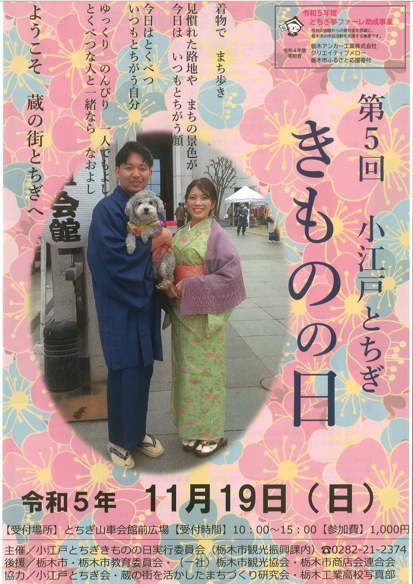 一般社団法人 全日本きもの振興会が11月15日を「きものの日」と定めていることから、同時期の休日を「小江戸とちぎ きものの日」とし、江戸情緒漂うとちぎを着物で街歩きすることで、「着物の似合う街とちぎ」を市内外に広くアピールすることを目的として、令和元年6月15日に制定しました。