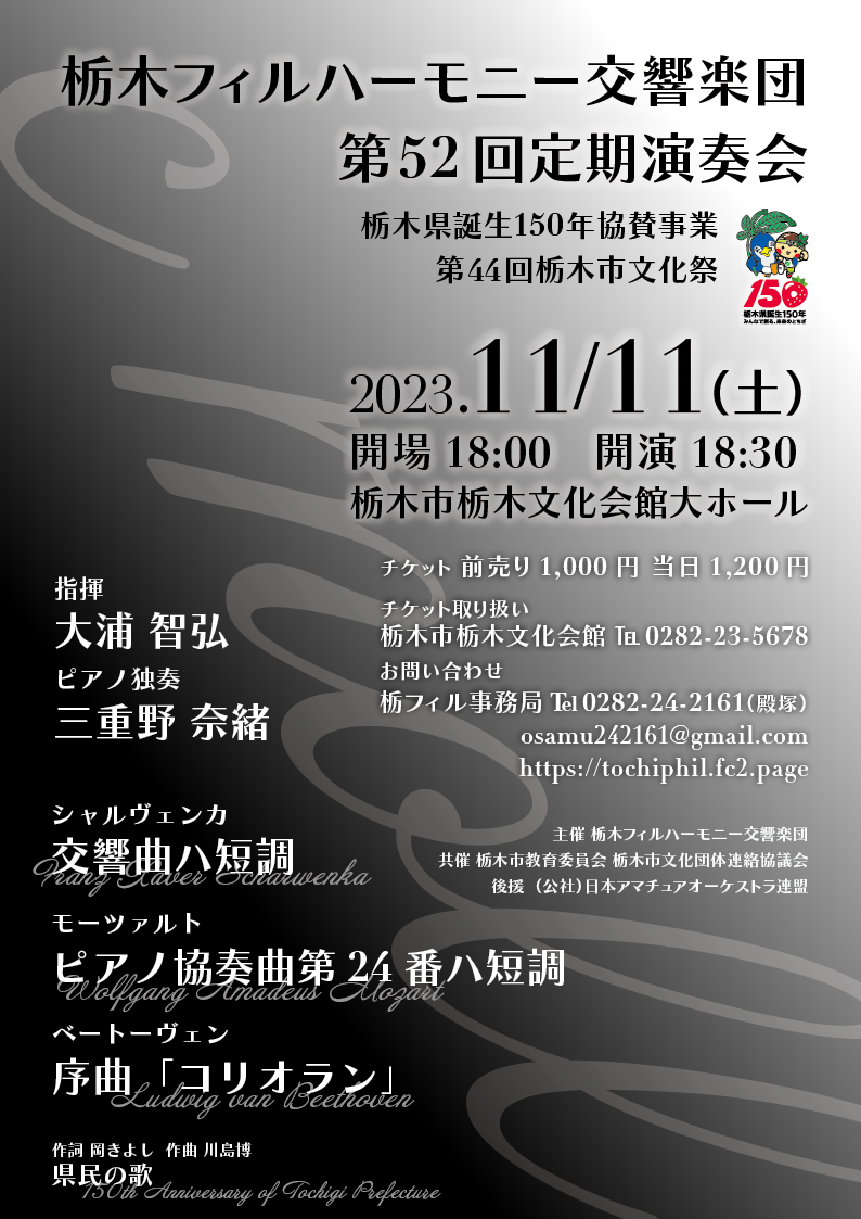 | お問い合わせ | 栃木フィルハーモニー交響楽団事務局(殿塚 方) TEL 0282-24-2161 https://tochiphil.fc2.page/ |