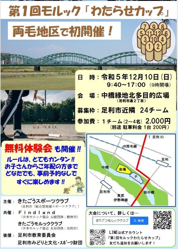 | お問い合わせ | 主催:きたごうスポーツクラブ(足利市 総合型地域スポーツクラブ) 共催:findland(館林市 日本モルック協会 公認団体) きたごうモルッククラブ(足利市 日本モルック協会 友好団体) 後援:足利市教育委員会 足利市みどりと文化・スポーツ財団 メール:molkky@kitagou-sports.club |