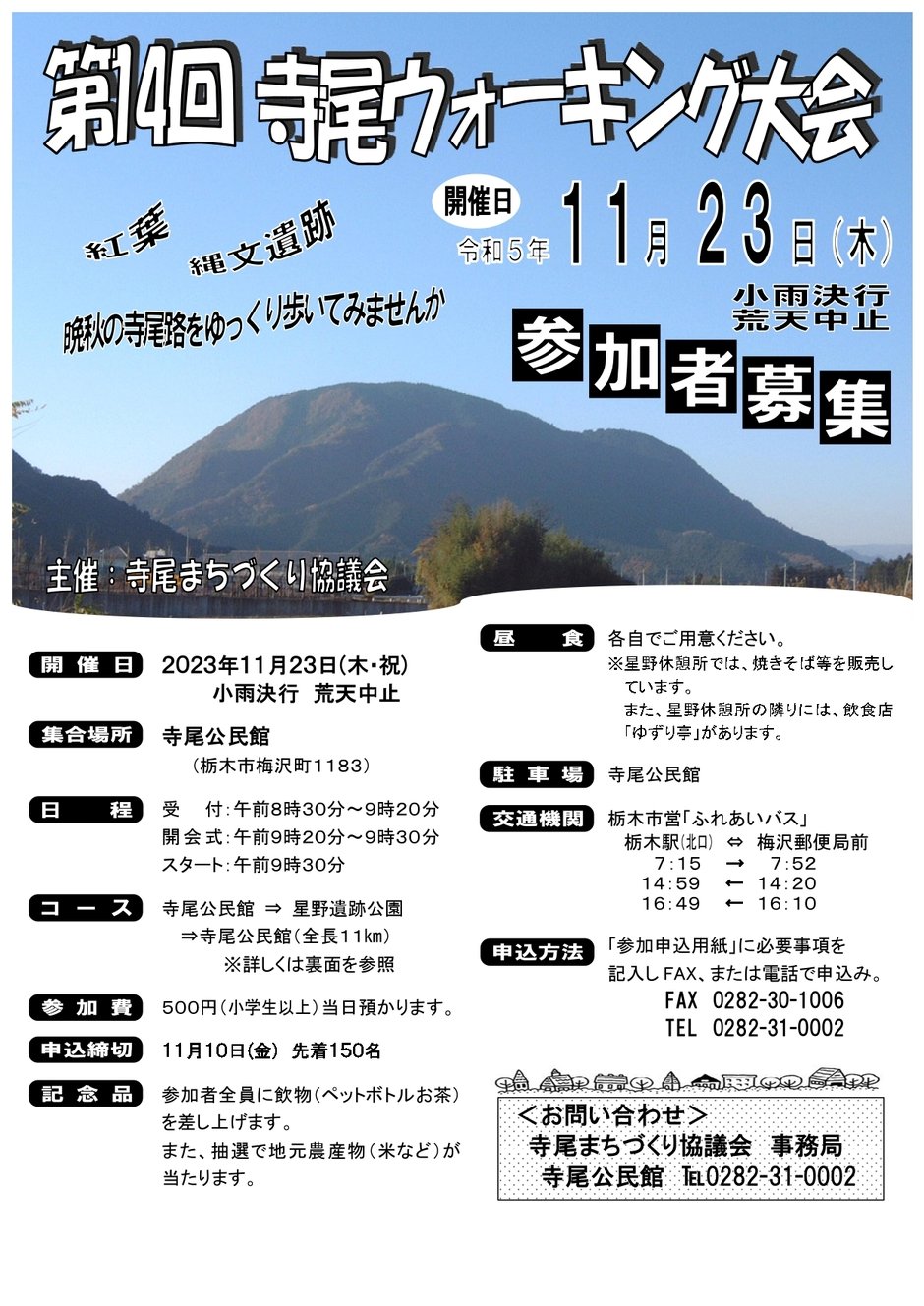 | お問い合わせ | 主催:寺尾まちづくり協議会 事務局:栃木市寺尾公民館 TEL 0282-31-0002 FAX 0282-30-1006 |
