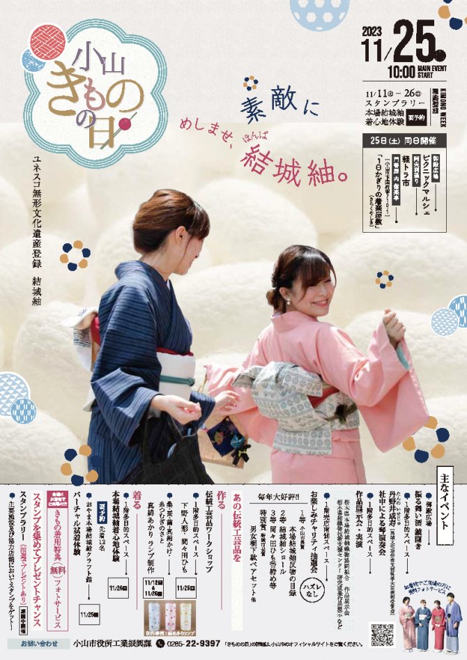 「小山きものの日」は市の誇る伝統産業「本場結城紬」の情報発信と和装振興のため、「きもの」を楽しんでいただく催しです。