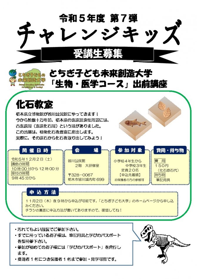 11月2日(木)夜9 時から申込が可能です。「とちぎ子ども大学」のホームページから申し込みください。