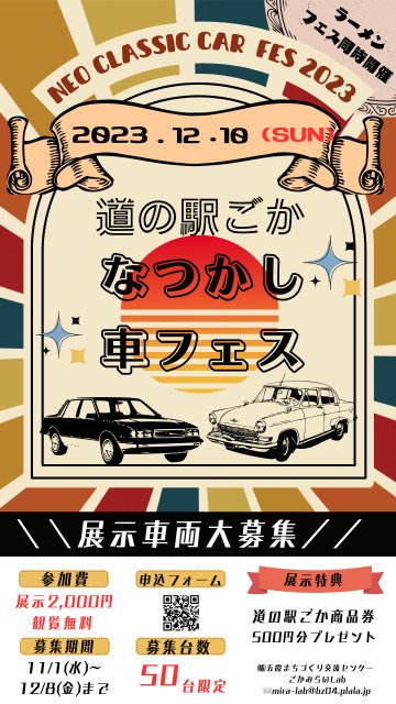 茨城県道の駅ごかでは、12月10日(日)になつかし車フェス&ラーメンフェスを同時開催する。