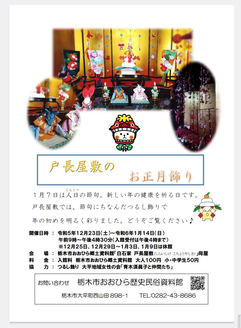 戸長屋敷の母屋に、1月7日の「人日(七草)の節句」にちなんで、お正月の縁起物などを表現したつるし雛などの飾りつけをいたします。