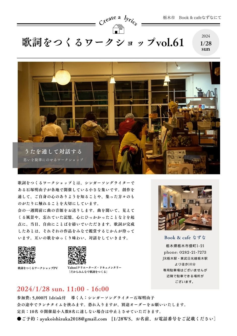 | お問い合わせ | ご予約 ayukoishizuka2018●gmail.com ●を@に変えて送信してください。 1/28WS、お名前、お電話番号をご記載ください |
