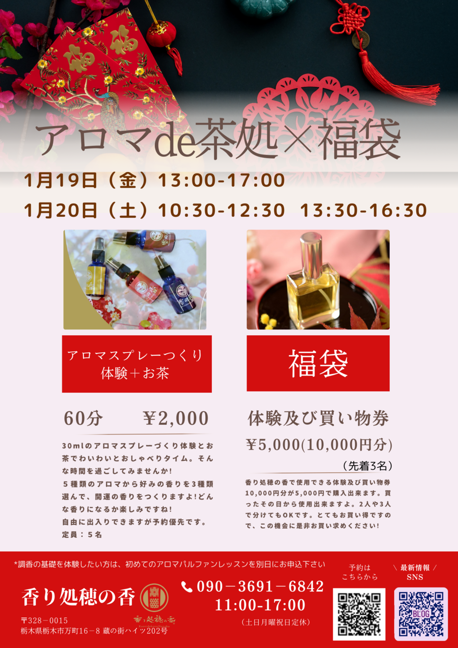 同時開催企画として、福袋を用意しました。香り処穂の香で使用できる10,000円分の券が5,000円にて購入できます。当日の使用もOK、何人かで分け合ってもOKです。お得にご利用下さい。福袋は両日併せて先着3名様までとさせて頂きます。気になる方は、早めのお買い求めをお薦めします。