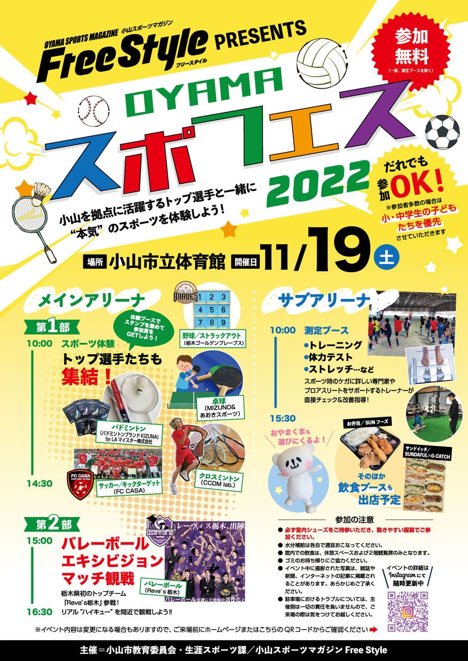 小山市を拠点に活動するプロチームや、スポーツブランド、ショップなどが一堂に会し、さまざまな竸技が体験できるほか、スポーツトレーナーが体の状態を測定するブースなども設置。また、昨年創立された栃木県初のバレーボールトップチーム「Reve's 栃木」によるエキシビションマッチも間近で観戦できる内容となっています。