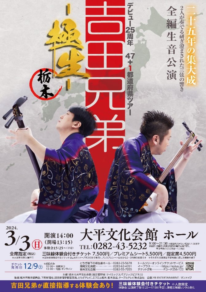 日本を代表する津軽三味線奏者吉田兄弟がデビュー25周年を記念して、47都道府県で津軽三味線の魅力を楽器とホールの響きだけでパフォーマンスを行う生音公演。