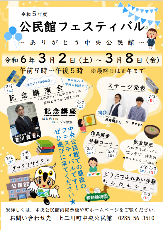 中央公民館で行われる最後のフェスティバルですので、みなさんぜひ、遊びに来てください!