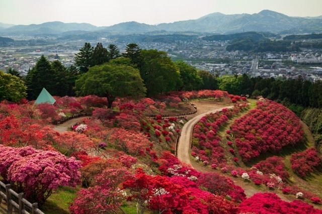 現在では、7haのつつじ公園に霧島、日の出、久留米、ヤマツツジなど様々な種類のつつじが8,500株最盛期には小高い山が真っ赤にそまる。