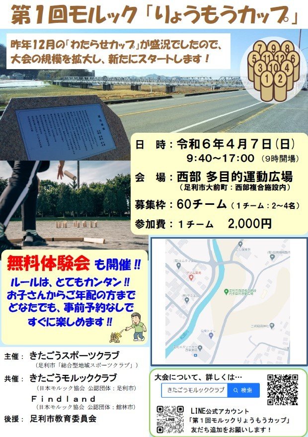 昨年12月、両毛地区で初めてのモルック大会(第1回モルック「わたらせカップ」)を開催させていただいたところ、多くのチームにエントリーいただきました。会場の都合で、残念ながら出場できなかったチームもあったため、大会の規模を拡大、大会会場・名称も変更し、新たにスタートいたします。