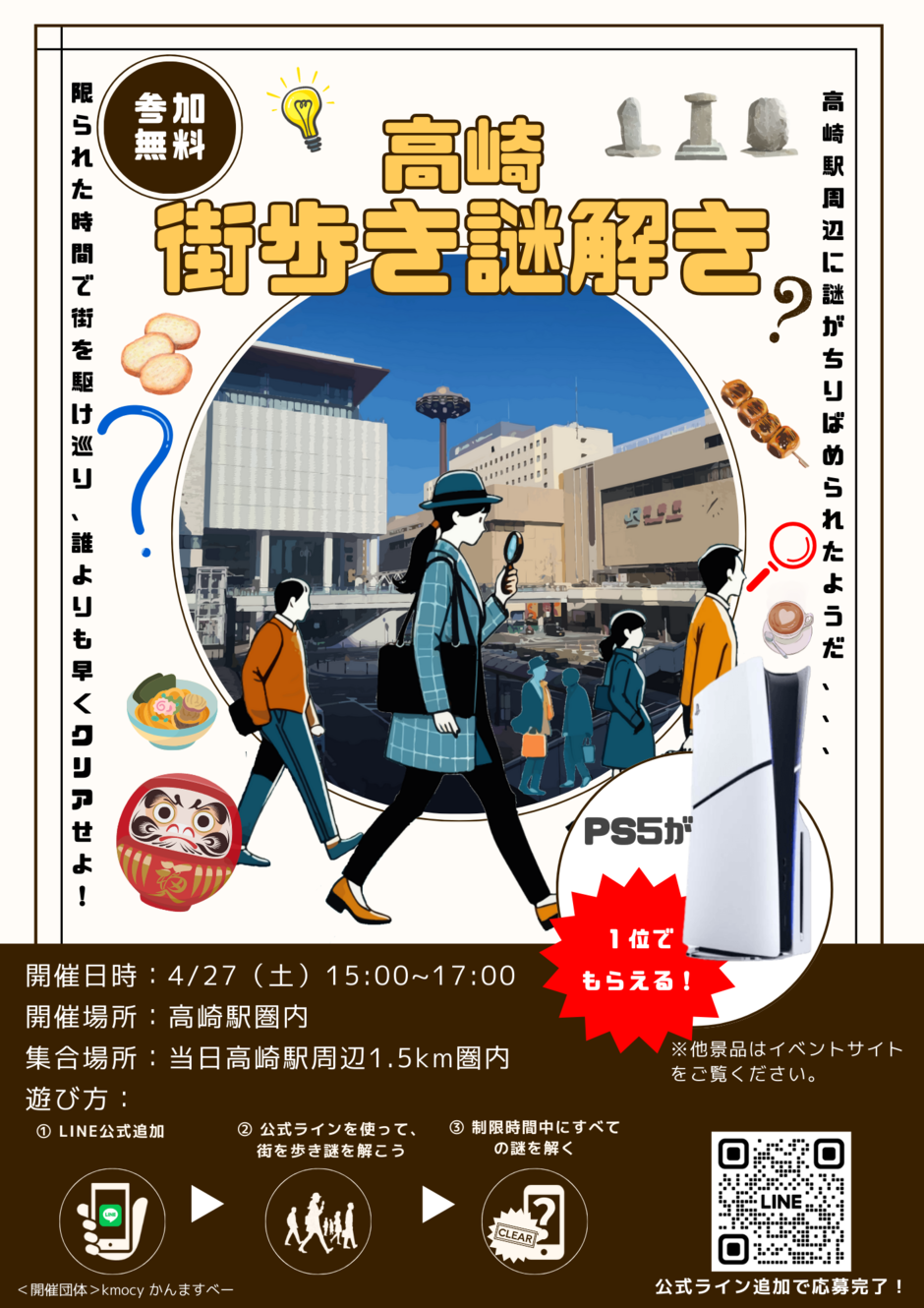| 場所 | 高崎駅周辺1.5km圏内 開始時刻までに公式ラインを追加して高崎駅1.5km圏内にお集まりください。 |