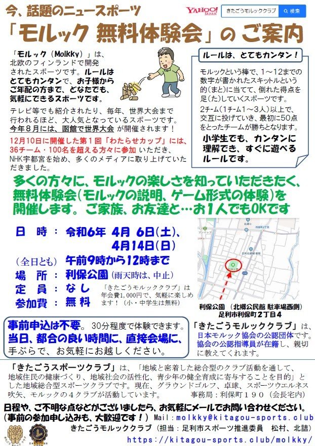 | お問い合わせ | きたごうモルッククラブ(日本モルック協会公認団体) molkky@kitagou-sports.club |