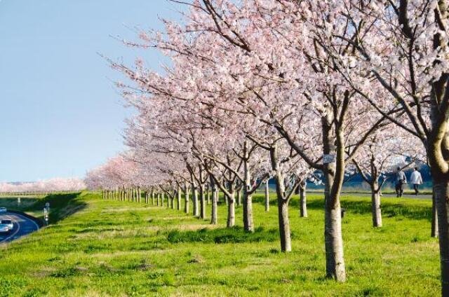 桜のオーナー制度によって、利根川の堤防上に整備された桜並木。全長約850mに渡って182本のソメイヨシノが植えられている。