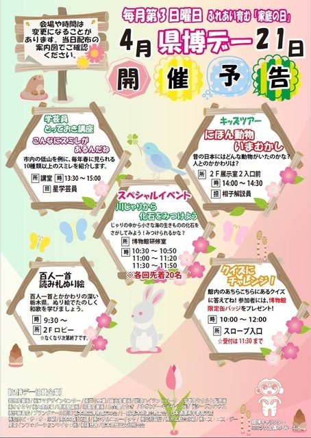 | 関連サイト | http://www.muse.pref.tochigi.lg.jp/exhibition/kenpakuday/kenpakuday.html |