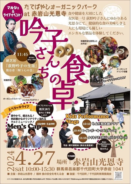 健康的な食を大切にした日本初の女医、荻野吟子ゆかりの光恩寺にて、オーガニック素材だけのこだわりの弁当、パン、スイーツ、ドリンクなど、体にやさしい食を楽しむイベント。