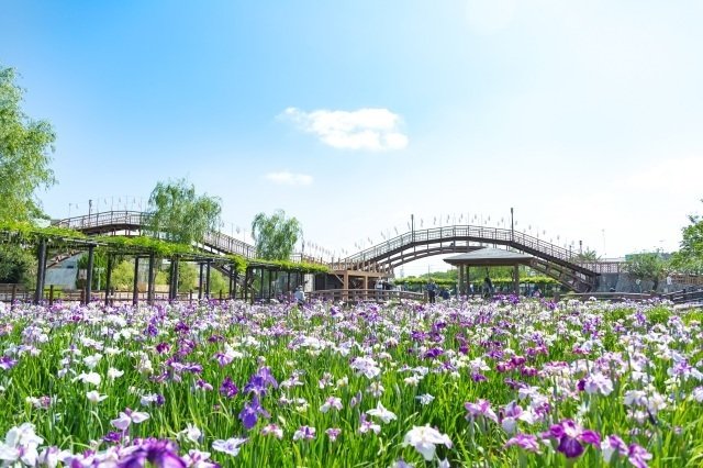 昭和27年から始まった歴史あるまつり。約500種100万株の紫・白・黄色の花菖蒲が早咲きから遅咲きまで美しく咲き誇る。