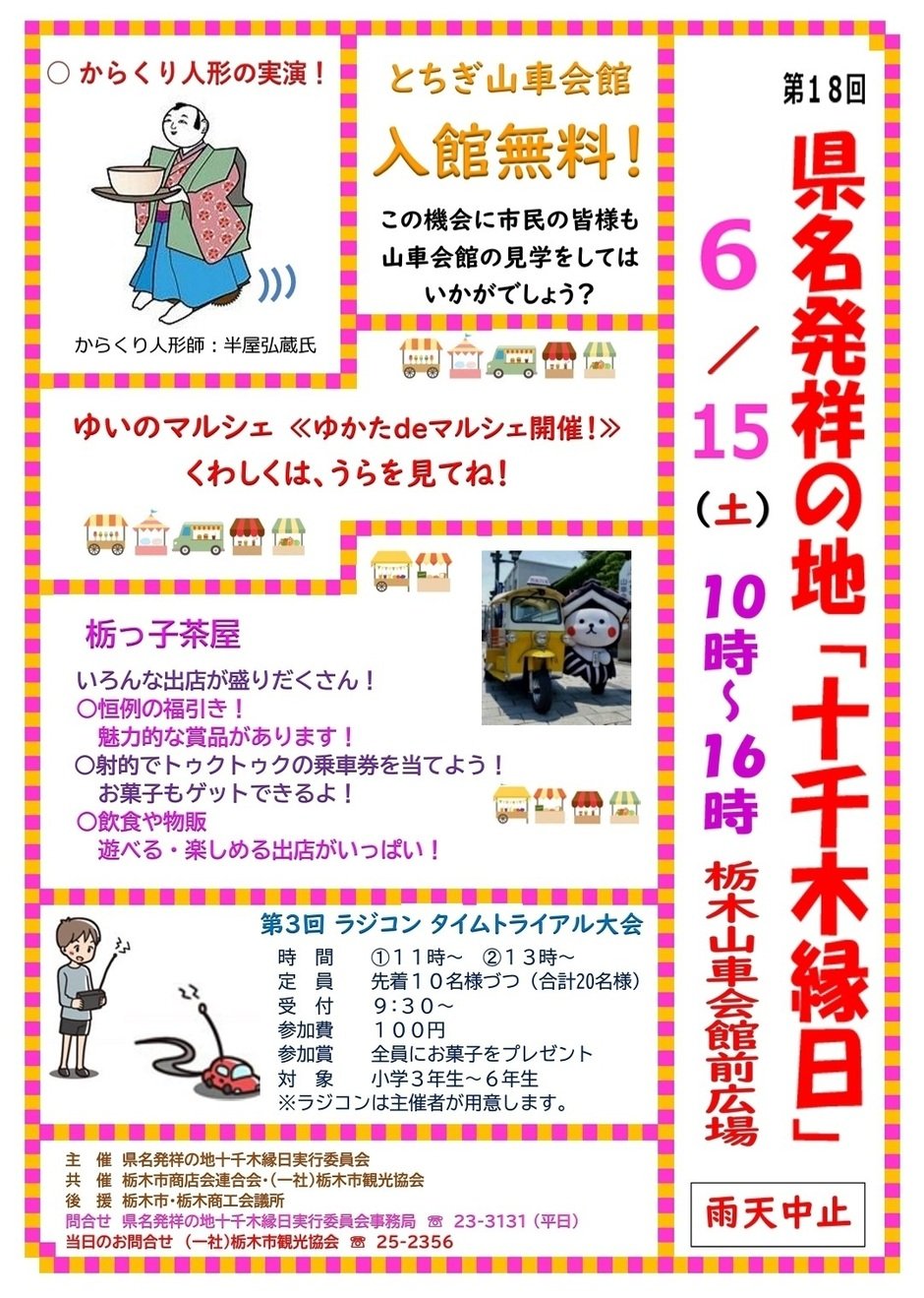 | お問い合わせ | 県名発祥の地十千木縁日実行委員会事務局 TEL:0282-23-3131(平日のみ) ※当日のお問合せ:(一社)栃木市観光協会 |