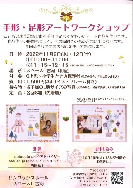 こどもの成長記録である手形や足形でかわいいアート作品を作る。作品作りの時間も楽しく、その時間そのものが想い出になる。今回はクリスマスの台紙を使って制作する。持ち物は子どものL版サイズの写真(兄弟の場合、兄弟で撮影したL版写真1枚)。対象は0才児~小学生とその保護者。定員は各回8組(先着順)。申込は10月25日(火)13時受付開始(電話にて)。