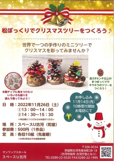 世界で一つの手作りのミニツリーでクリスマスを彩ってみてはいかが? 高さ8cm以上のまつぼっくりでキラキラのツリーをつくろう! 木製チップに色をつけたりいろいろな飾りを選んで飾ってみよう! 定員は各回10組(先着順)。小学二年生以下は保護者同伴で参加を。11月14日(月)10時~電話受付開始。