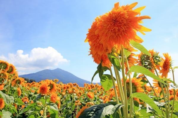 日本百名山である筑波山をバックに、八重ひまわりが約100万本咲き誇ります。