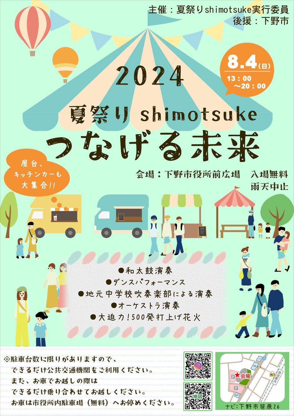 8月4日(日曜日)13:00~20:00 下野市役所前広場にて、夏祭りshimotsuke~つなげる未来~を開催します。