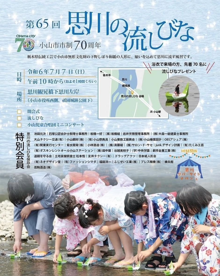 栃木県伝統工芸で小山市無形文化財の下野しぼり和紙の人形に、願いを込めて思川に流す風習です。