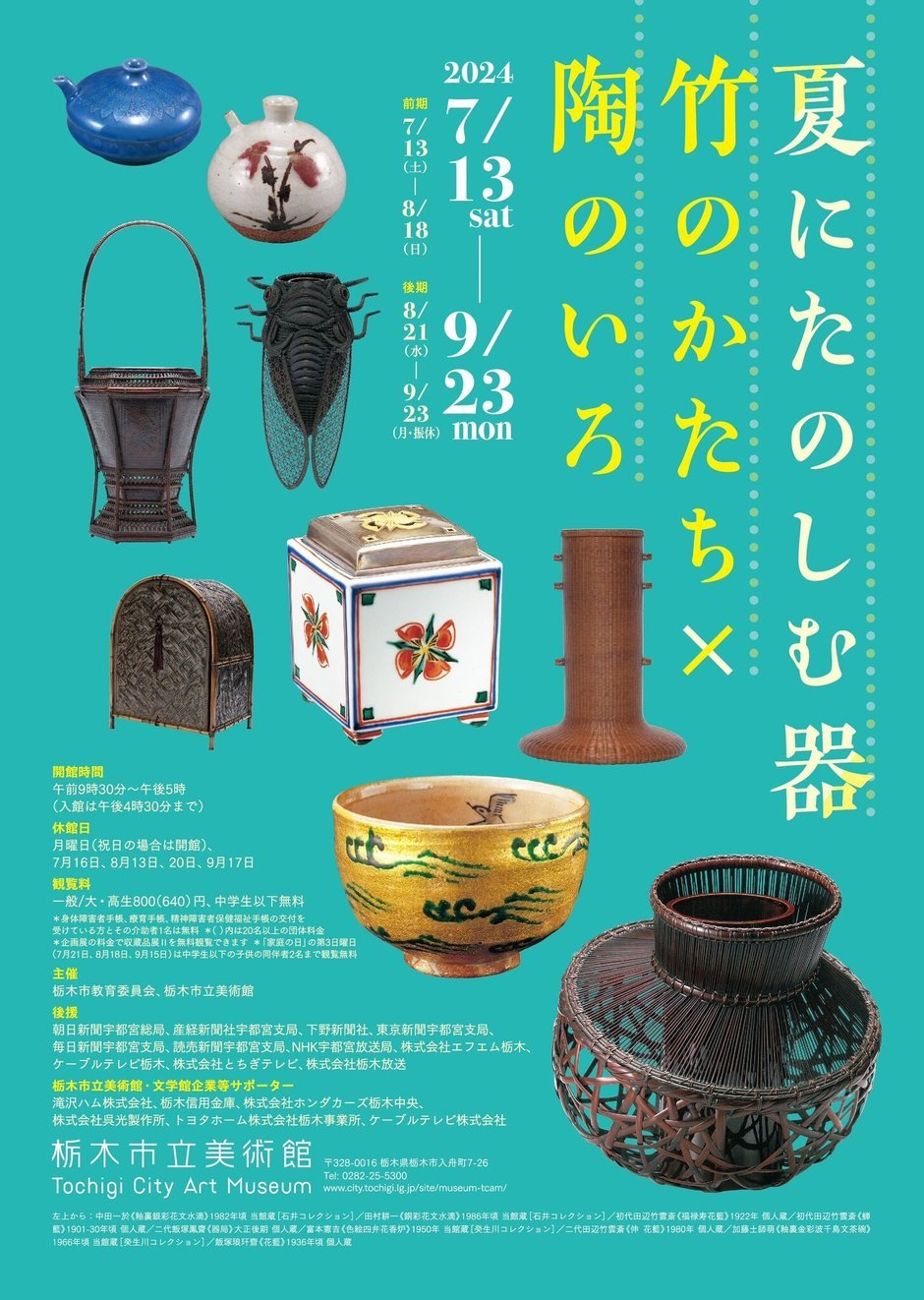 本展は「夏にたのしむ器」をテーマとして、収蔵品を中心に竹の花籠などの形、陶磁器や水滴に装飾された色に注目します。竹工芸は個人コレクターの協力を得て、初代と二代の田辺竹雲斎の作品を展覧し、東京と大阪の竹工芸の一端を紹介します。陶芸は重要無形文化財保持者(通称 人間国宝)に認定されている富本憲吉、浜田庄司、加藤土師萌、近藤悠三が優れた技で表現した装飾を、当館の寄贈コレクションの陶磁器や水滴からご覧いただきます。