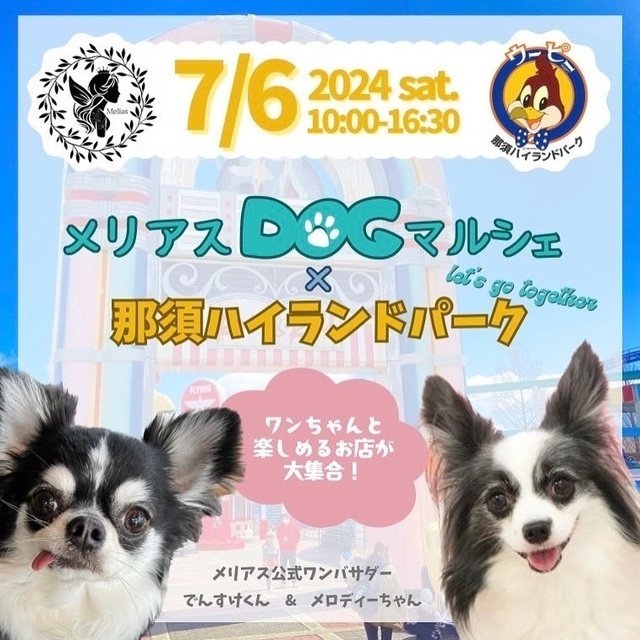 メリアスdogマルシェ栃木初上陸。初夏の那須で愛犬と一緒に素敵な思い出をつくろう!マルシェではわんこのショップや、こどもが楽しめるショップが並ぶ。メリアスマルシェの本拠地、埼玉県を中心に東京、千葉、山梨、静岡、富山、福島、奈良など各方面から人気のショップが集まる。犬種別オフ会も開催予定。メリアスdogマルシェだけの特典付前売りチケット販売。ハズレなし抽選券やオリジナルフラッグプレゼント。