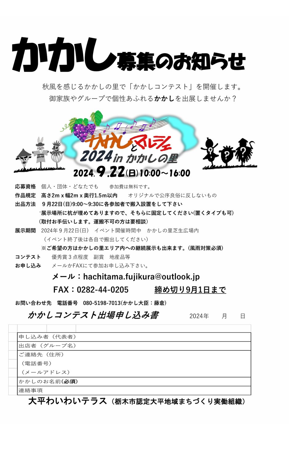 | お問い合わせ | 栃木市認定大平地域まちづくり実働組織 大平わいわいテラス かかしとマルシェ実行委員会 かかし大臣080-5198-7013 fujitatu.futabatool-f7@ezweb.ne.jp |