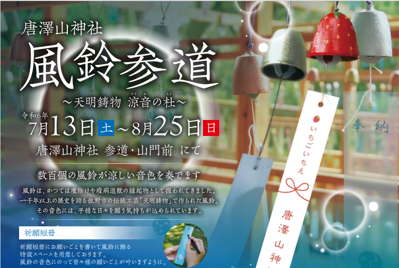 夏の風物詩である納涼行事「唐澤山神社 風鈴参道~天明鋳物 涼音の杜~」が開催され、期間中、佐野市の伝統工芸である「天明鋳物」でできた風鈴が数百個並びます。
