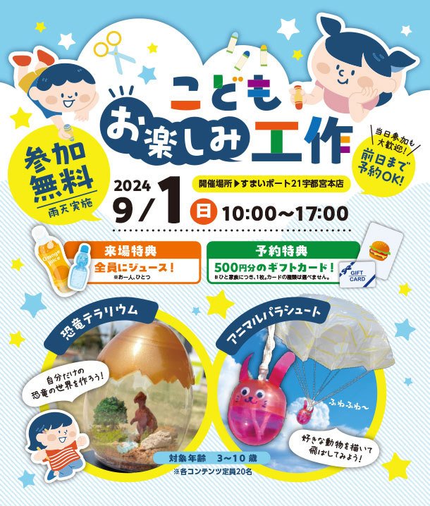 9/1(日)すまいポート21宇都宮本店で、キッズ向けイベント「こども お楽しみ工作」を開催します!参加は無料!「恐竜テラリウム」や「アニマルパラシュート」が作れるよ!参加者全員にジュースのプレゼントもアリ。予約なしの参加もOKですが、前日までに予約をすると500円分のマックカード or QUOカードももらえちゃいます^^