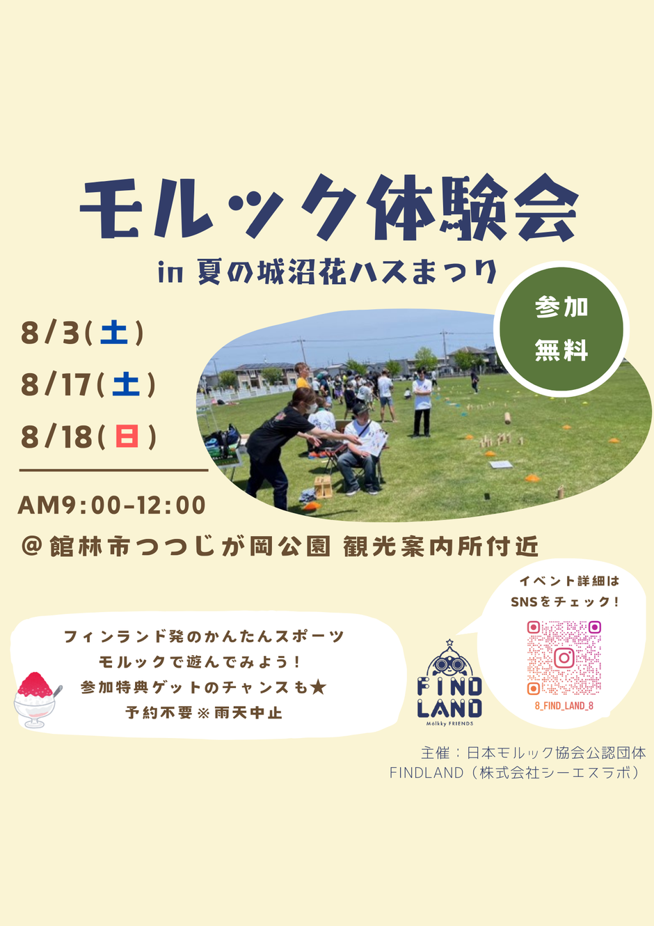 | お問い合わせ | <主催>日本モルック協会公認団体 FINDLAND <協力>館林市つつじのまち観光課、株式会社シーエスラボ |