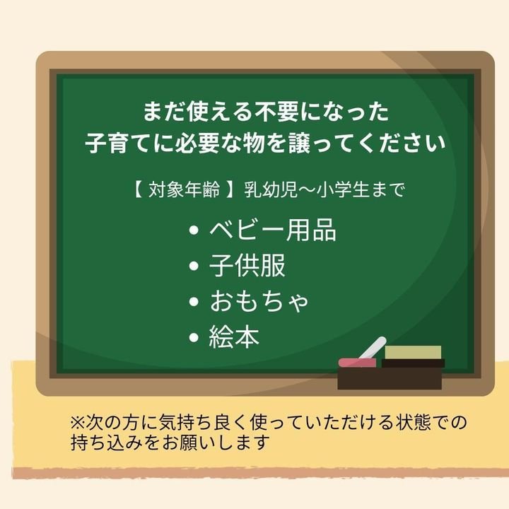 お子様の物で、次に必要な方が気持ち良く使っていただける状態の物を、1人で持ち帰れる段ボール一箱の大きさまでで、会場に直接、持参してください。