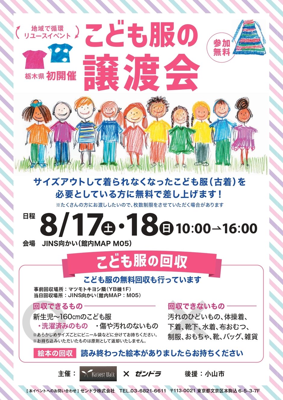 この無料譲渡会は、ハーヴェストウォークとゼンドラ株式会社が共同で開催するイベントとなり、「子育て」領域の取組みとして、小山市の後援をいただいております。サイズアウトしてしまったこども服や、まだ着られそうなこども服を必要な方々へ橋渡しし、地域内で循環させながら、ごみの減量など、地域の皆様のためにお役に立てたらと思い活動しております。