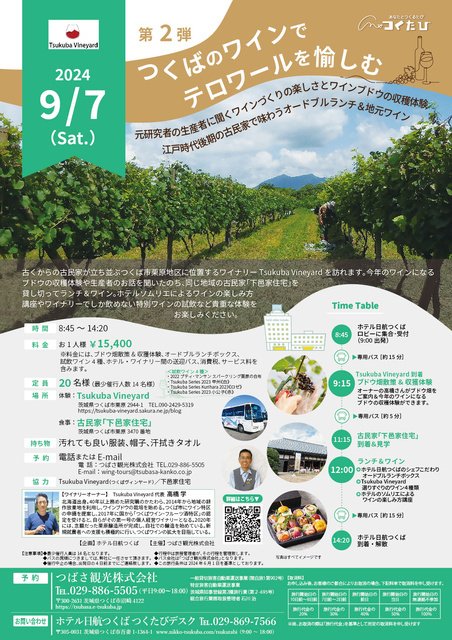 古くからの古民家が立ち並ぶつくば市栗原地区に位置するワイナリーTsukuba Vineyardを訪れる。今年のワインになるブドウの収穫体験や生産者のお話を聞いたのち、同じ地域の古民家「下邑家住宅」を貸し切ってランチ&ワイン。ホテルソムリエによるワインの楽しみ方講座やワイナリーでしか飲めない特別ワインの試飲など貴重な体験を楽しもう。
