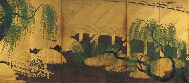 写真:長谷川宗宅《柳橋水車図屏風》 桃山時代 群馬県立近代美術館 戸方庵井上コレクション 群馬県指定重要文化財 (通期)