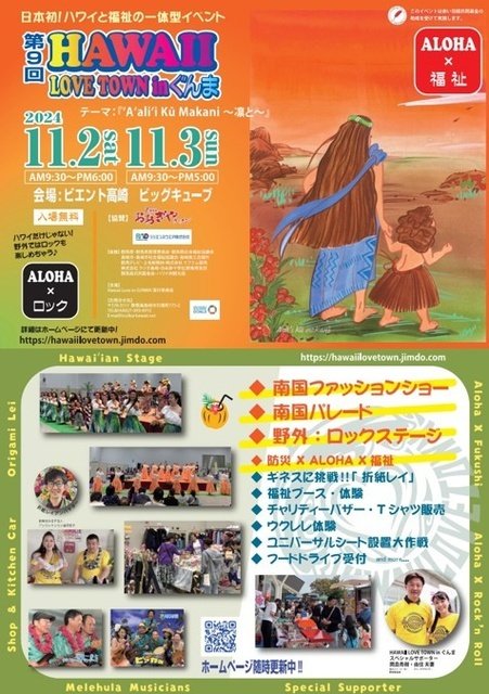 Aloha×福祉「第9回Hawaii Love Town inぐんま」を開催。障がいがあってもなくても皆が同じ場所で一緒にハワイを感じて楽しむイベント。今年は「障がい者のいざという時の防災対策」ブースを設置。フードドライブやチャリティバザーなどあり、またフラダンサーが約1300人参加のステージ以外にも誰でも参加できる南国パレードや南国ファションショーを開催。