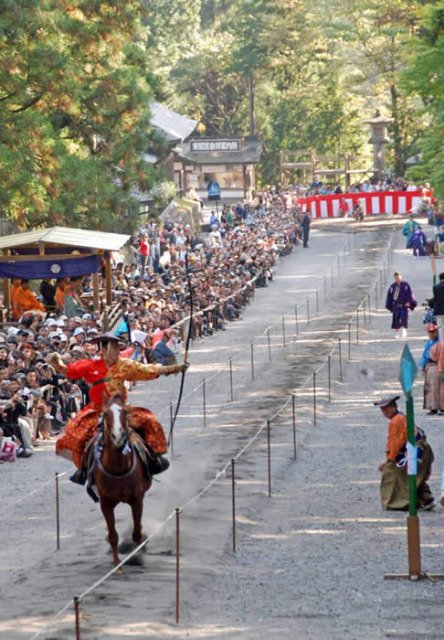 16日に表参道で行われる流鏑馬神事では、精鋭12人の射手が「陰陽射(いんようい)」という勇ましい掛け声とともに、馬上から次々と的を射抜く。17日には、春の例大祭より規模は小さいものの、徳川家康公の神霊を駿府久能山から日光へ改葬した当時の行列を再現した「百物揃(ひゃくものぞろえ)千人武者行列」と呼ばれる豪壮な「渡御祭」を催す。