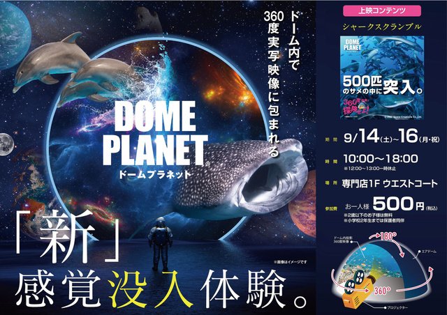 地球上の様々な自然・生き物・文化を360度映像で切り取り届けるドームプラネットを開催! 巨大なエアドームの中で360度の映像を見ることで、まるでその場にいるかのような体験ができる。今回は数百匹ものサメが泳ぐ海に突入する「シャークスクランブル」を上映する。