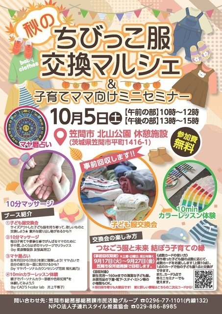 子ども服の交換会と子育て中の母親向けのミニセミナーを開催する。子ども服は市役所にて事前回収を行い、1家庭につき10点の子ども服を持ち込める。未使用の靴下、スタイなども回収対象。持ち込まれた子ども服の点数に応じてカードを配布する。カード1点で子ども服1枚と、カード3点でミニセミナーを楽しむことが出来る。イベントをより楽しむためには子ども服の持ち寄りが必要である。イベント詳細は市HP参照。