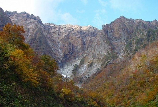 谷川岳ロープウェイバス停から国道を約3.5km行くと、突然視界が開け、前方奥にそそり立つ一ノ倉沢が出現。標高差1000mを一望するのは圧巻。アルプスのような山容からクライマーに人気のスポット。10月中旬~下旬には紅葉が楽しめ、一面が赤や黄色に染まる。