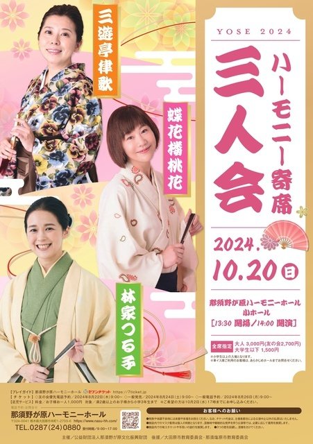 今年のハーモニー寄席は、女性尽くし。華やかに贈る。出演は落語:三遊亭律歌・蝶花楼桃花・林家つる子。 ※小学生以上の入場