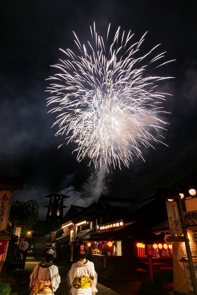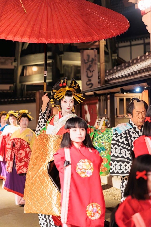 妖艶にライトアップされた夜の江戸を舞台に、忍者や町人のアトラクション、豪華で華やかな花魁道中、江戸の町上空に大輪の花模様をひろげる打ち上げ花火やライブ演奏を楽しめます。