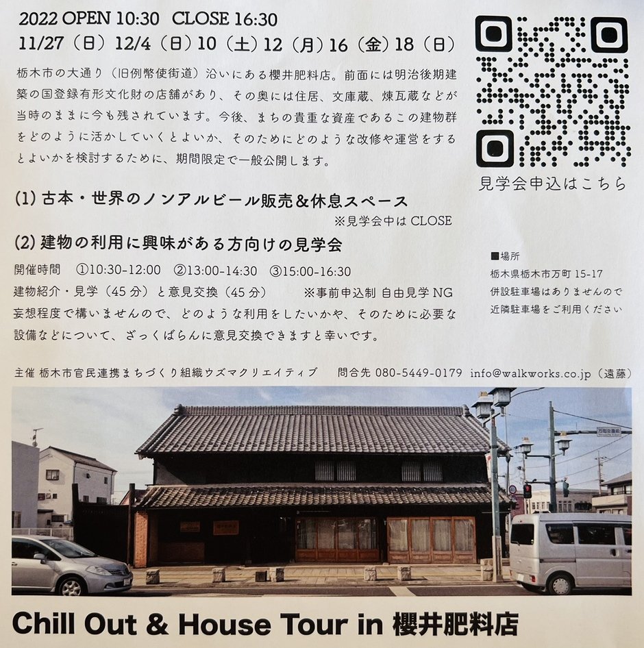 | お問い合わせ | 栃木市官民連携まちづくり組織ウズマクリエイティブ 080-5449-0179 info@walkworks.co.jp(遠藤) |