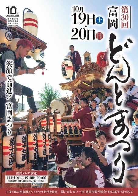 世界遺産富岡製糸場のある富岡市で、2日間にわたって開催されるお祭り。山車とお囃子やおどりなど、盛りだくさんのイベント! 今年のテーマは、「笑顔で前進!富岡まつり」。富岡どんとまつりの30回目の開催、富岡製糸場世界遺産登録10周年の節目を迎え、過去の歴史と伝統を踏まえ、演じる人、観る人、みんなで創り上げながら、笑顔と元気を届けるまつりにしよう。