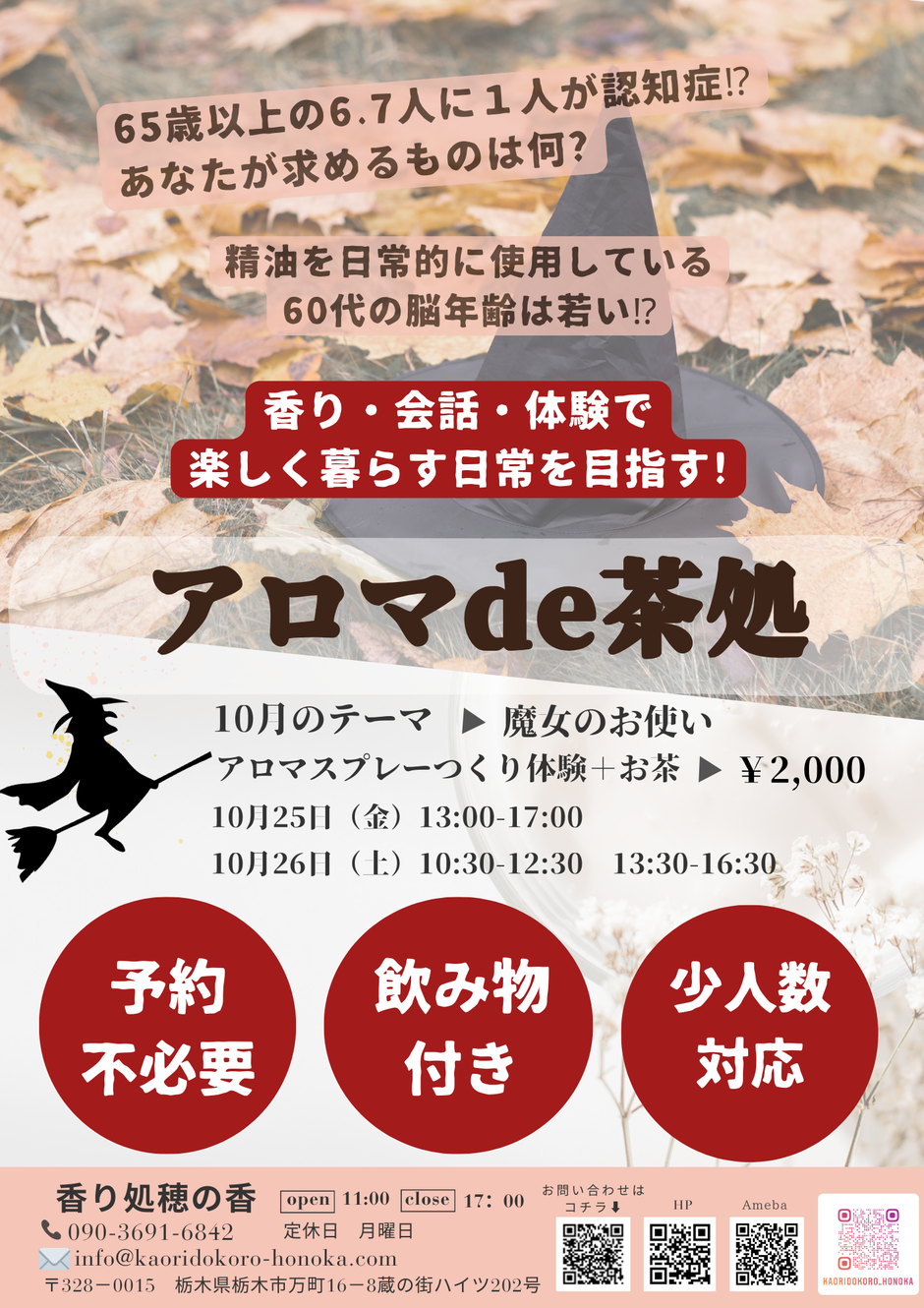 10月のアロマde茶処、香りのテーマは、“魔女のお使い”です。ハロウィンにちなんで“お菓子を配るお使いを頼まれた魔女”そのようなイメージで甘い香りのアロマスプレーを創りますよ。さて、どんな香りになるのでしょうか、お楽しみに 。